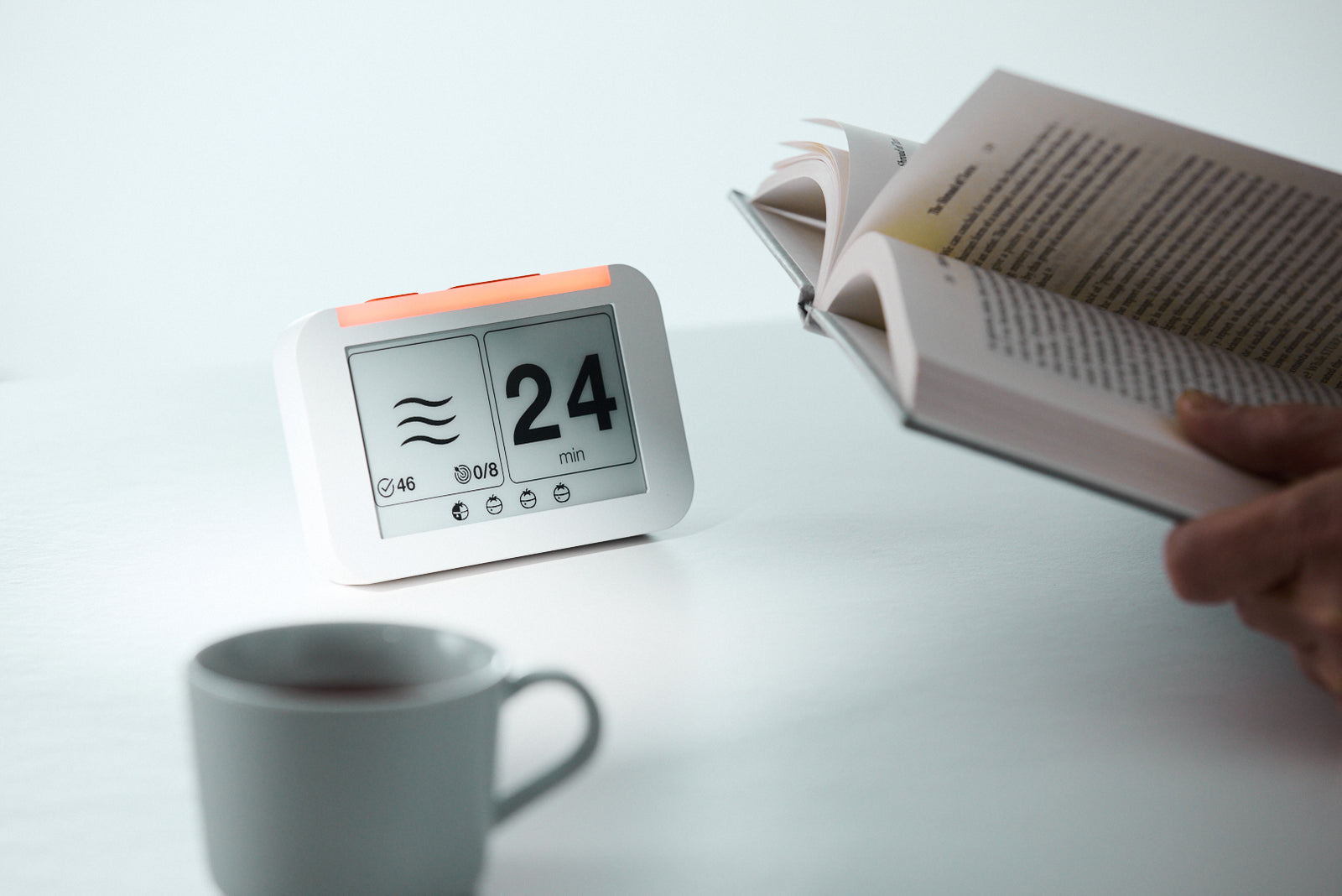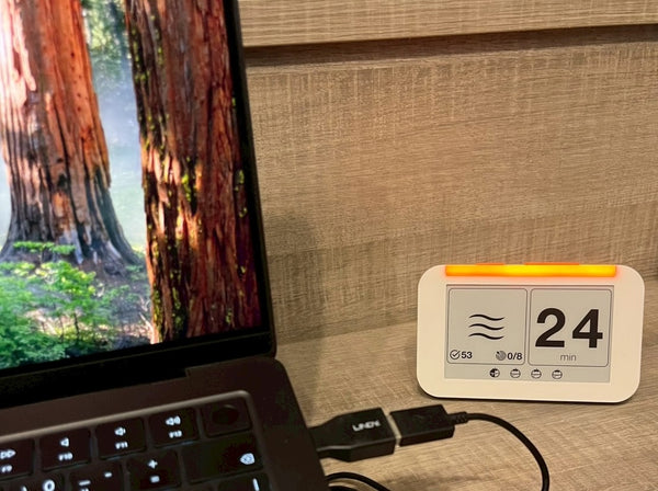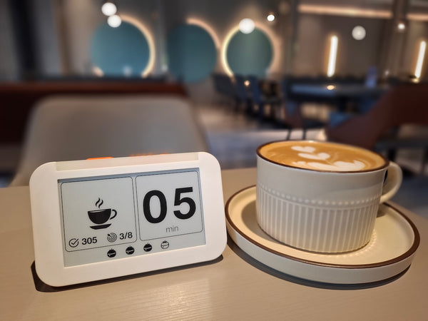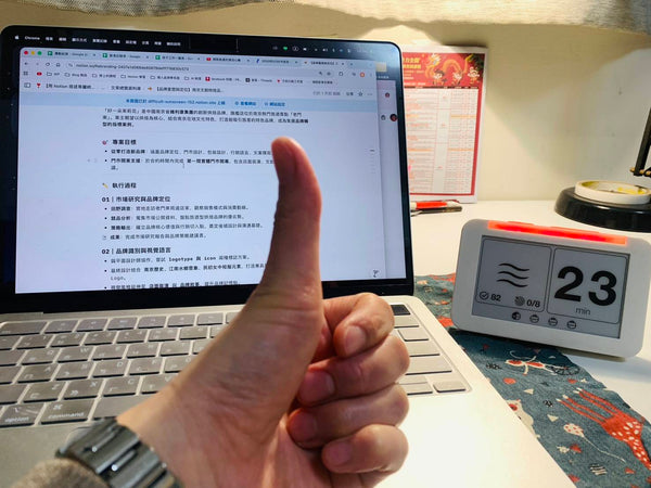 心流鐘透過以下設計有效解決我的困擾:首先是亮燈功能,它建立了清晰的視覺邊界,讓周遭人知道我正處於深思狀態,不想被打擾。 其次,它計時方式與量化番茄數,解決了我分不清該長休還是短休的困擾,同時省去了拿手機計時的分心機會。